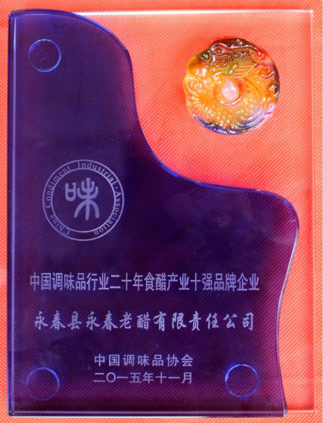 會議上,對行業(yè)20年來做出突出貢獻(xiàn)的企業(yè)、企業(yè)家代表進(jìn)行了表彰授獎。永春縣永春老醋有限責(zé)任公司在會上榮獲 了“中國調(diào)味品行業(yè)20年食醋十強(qiáng)品牌企業(yè)”的榮譽(yù)稱號。