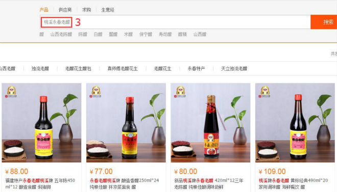 - 在搜索框中輸入“桃溪永春老醋”,從跳出的產(chǎn)品中點擊進入!