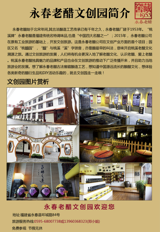 2016年經(jīng)各級(jí)旅游協(xié)會(huì)和各旅游質(zhì)量等級(jí)評(píng)定委員會(huì)評(píng)定,“永春老醋文創(chuàng)園”榮獲福建省2A景區(qū)!