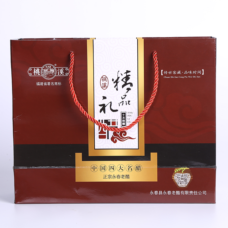 選用優(yōu)質(zhì)糯米、紅曲、原產(chǎn)地水源等為原料,傳承千年獨特釀造工藝(液態(tài)深層發(fā)酵),純糧釀造,歷經(jīng)五十多道生產(chǎn)流程,經(jīng)年發(fā)酵陳釀,平均酸度5.0-6.5。故出此風(fēng)味獨特,濃酸回甜,無添加劑,品質(zhì)上乘的桃溪永春老醋。具有酸、香、甜、鮮、色的特點,非常適合增味助鮮。采用精美的禮盒包裝,送禮自用兩相宜!送禮親朋,有禮有面!